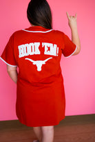 Get ready to rule the ballpark with our Licensed Burnt Orange Texas Hook Em Baseball Jersey Tee Dress! With the team's bold colors and sleek design, you'll stand out on game day. Made for comfort and style, this dress is perfect for baseball season and pairs perfectly with sneakers. Show off your team spirit in the most fashionable way!