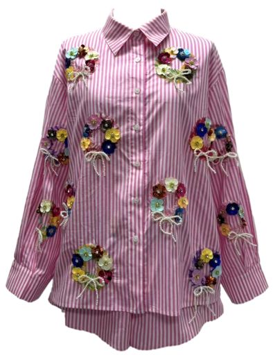 Pink & White Stripe Sequin Flower Wreath Cotton Button Up Top Queen of Sparkles