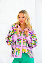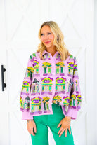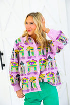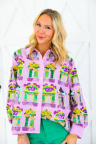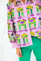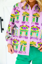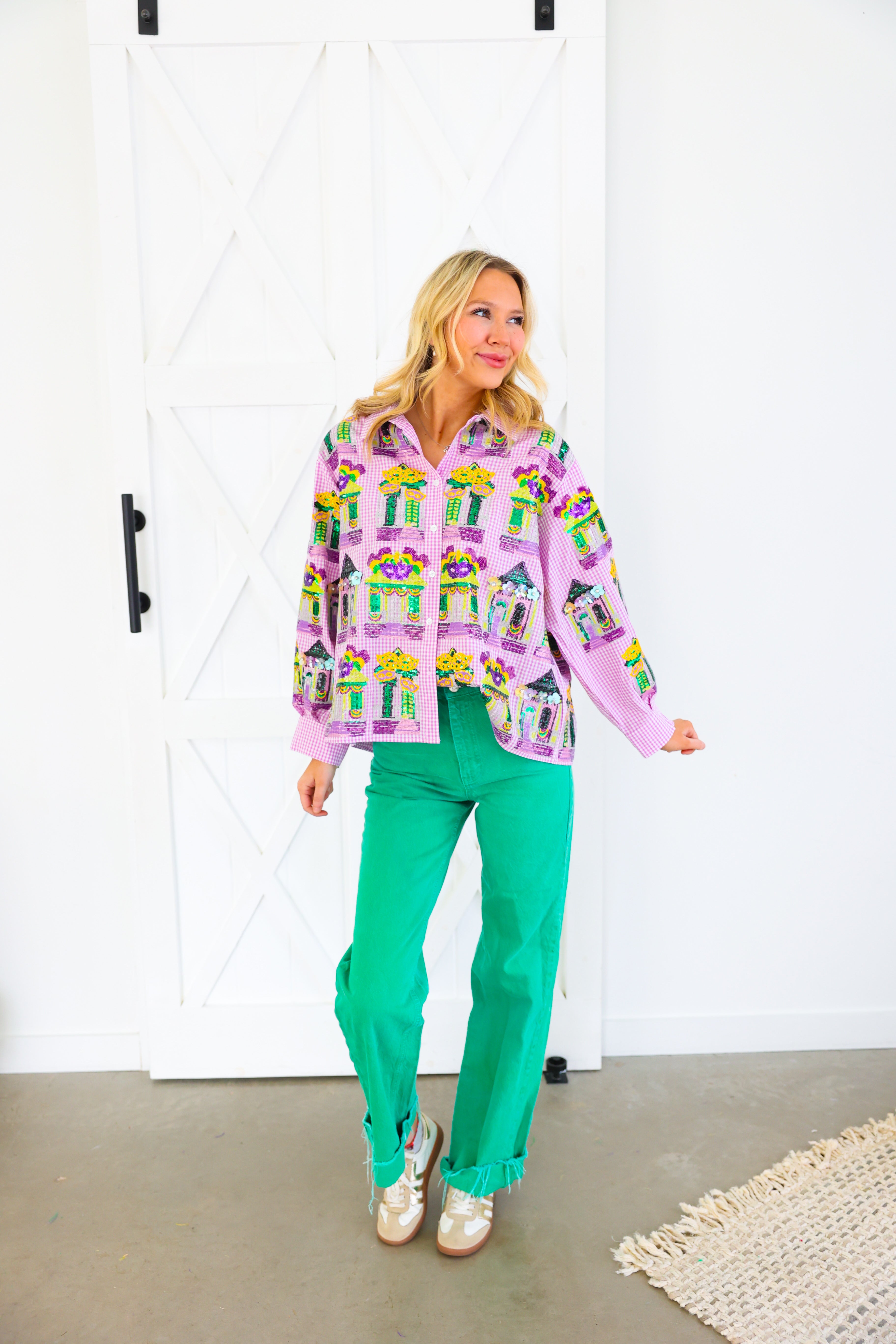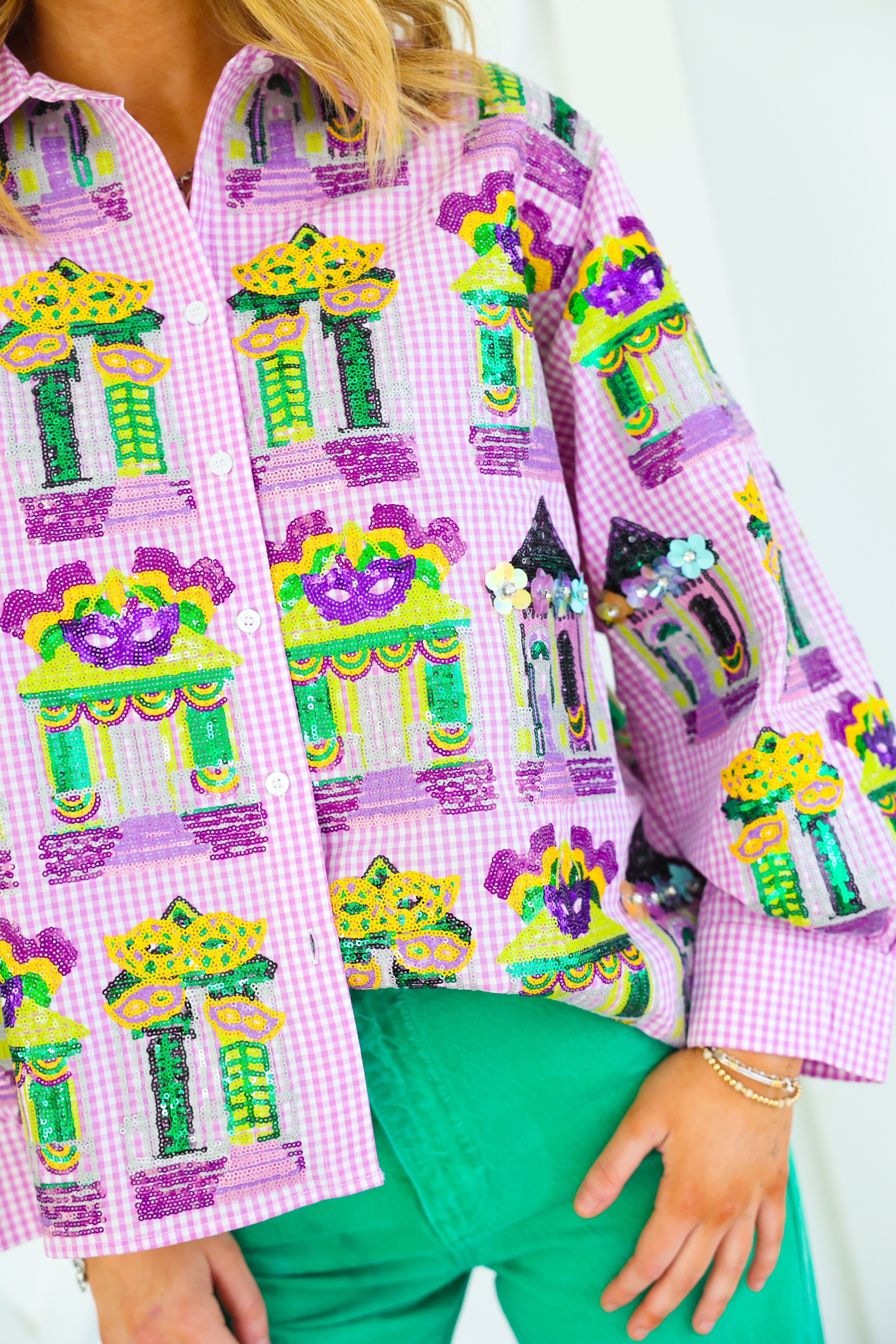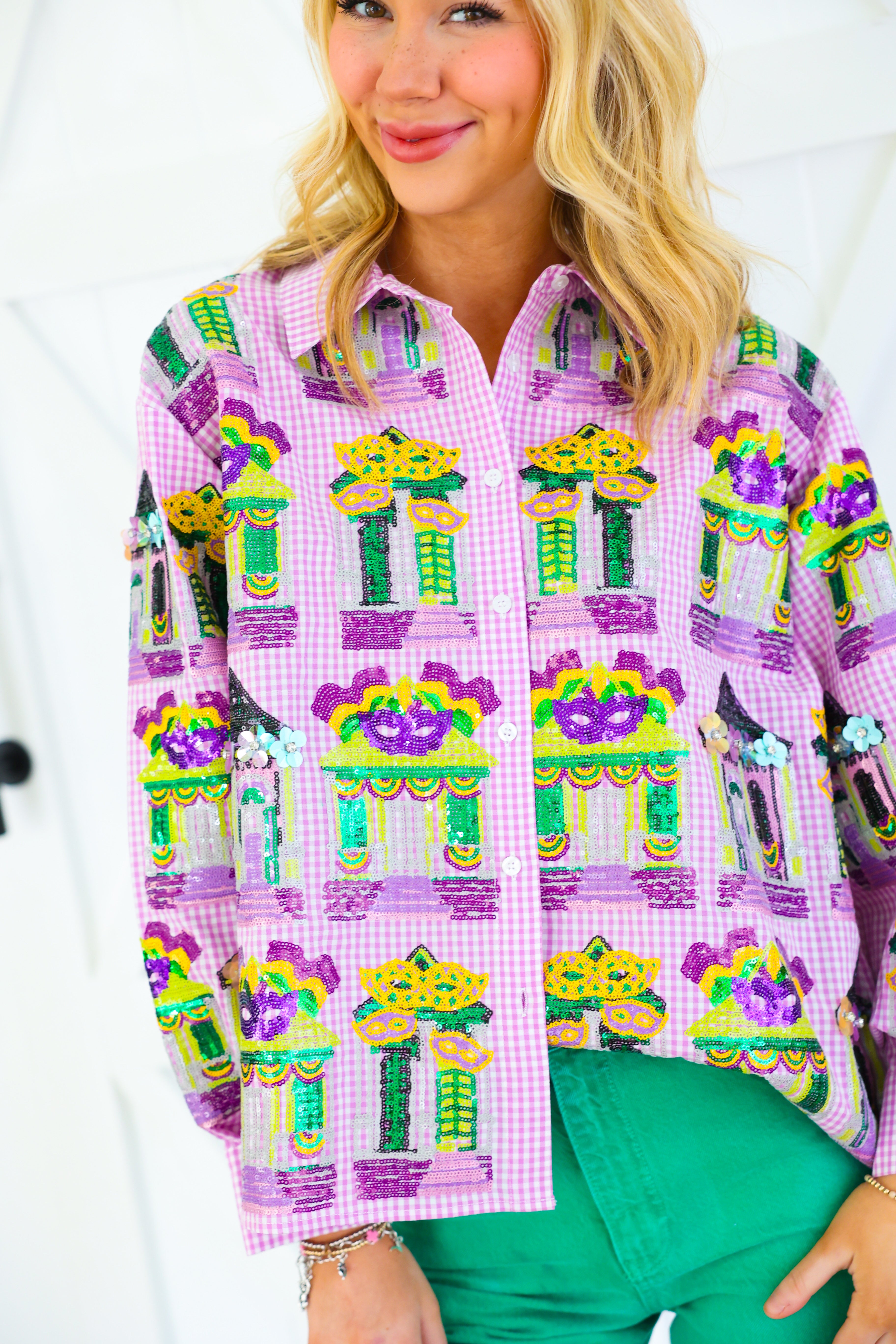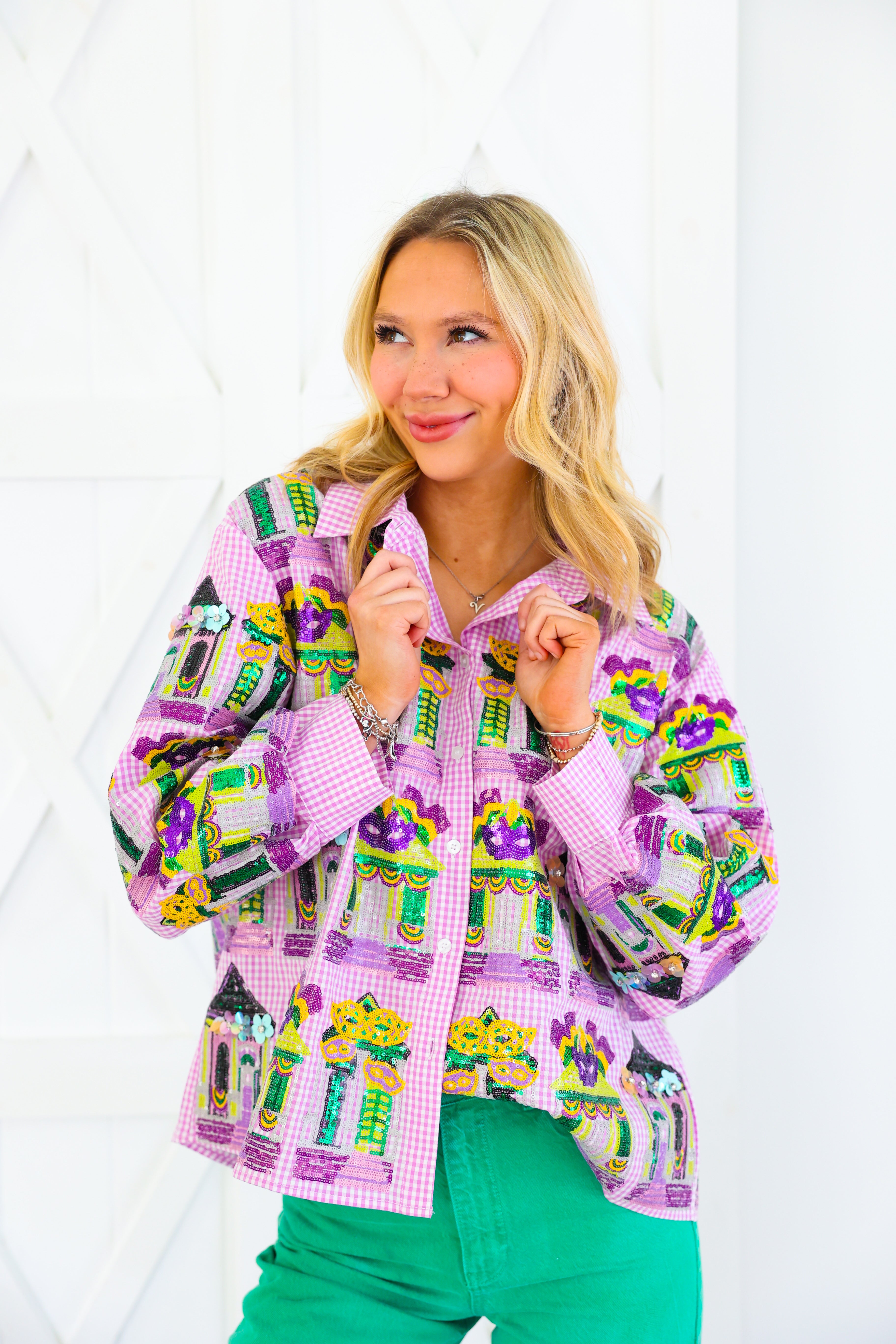 Celebrate in style with the Purple & White Gingham Mardi Gras Porches Button Up Top from Queen of Sparkles — the ultimate festive piece for parade season! This eye-catching top features vibrant, hand-sequined Mardi Gras porch designs in classic purple, green, and gold, all set against a charming gingham backdrop. Fun, playful, and unapologetically sparkly, it’s perfect for parades, parties, girls’ trips, and every event where you want to stand out. This top runs true to size and may fit slightly cropped on some body types; stay true to size or size up for added length.