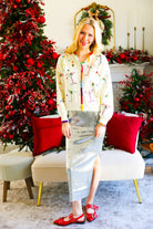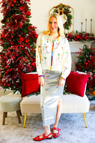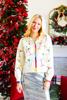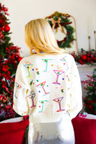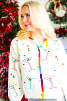 Embrace vibrant elegance with this White Multi Cosmo & Martini Button-Up Cardigan, featuring playful rainbow trim that adds a burst of color to any outfit. Designed for those who shine bright, its soft fabric and flattering fit make it perfect for layering and showing off your sparkle. Elevate your wardrobe with this standout piece that celebrates your unique style and confidence.