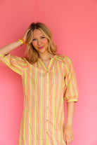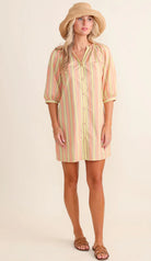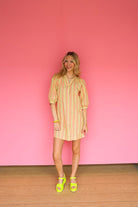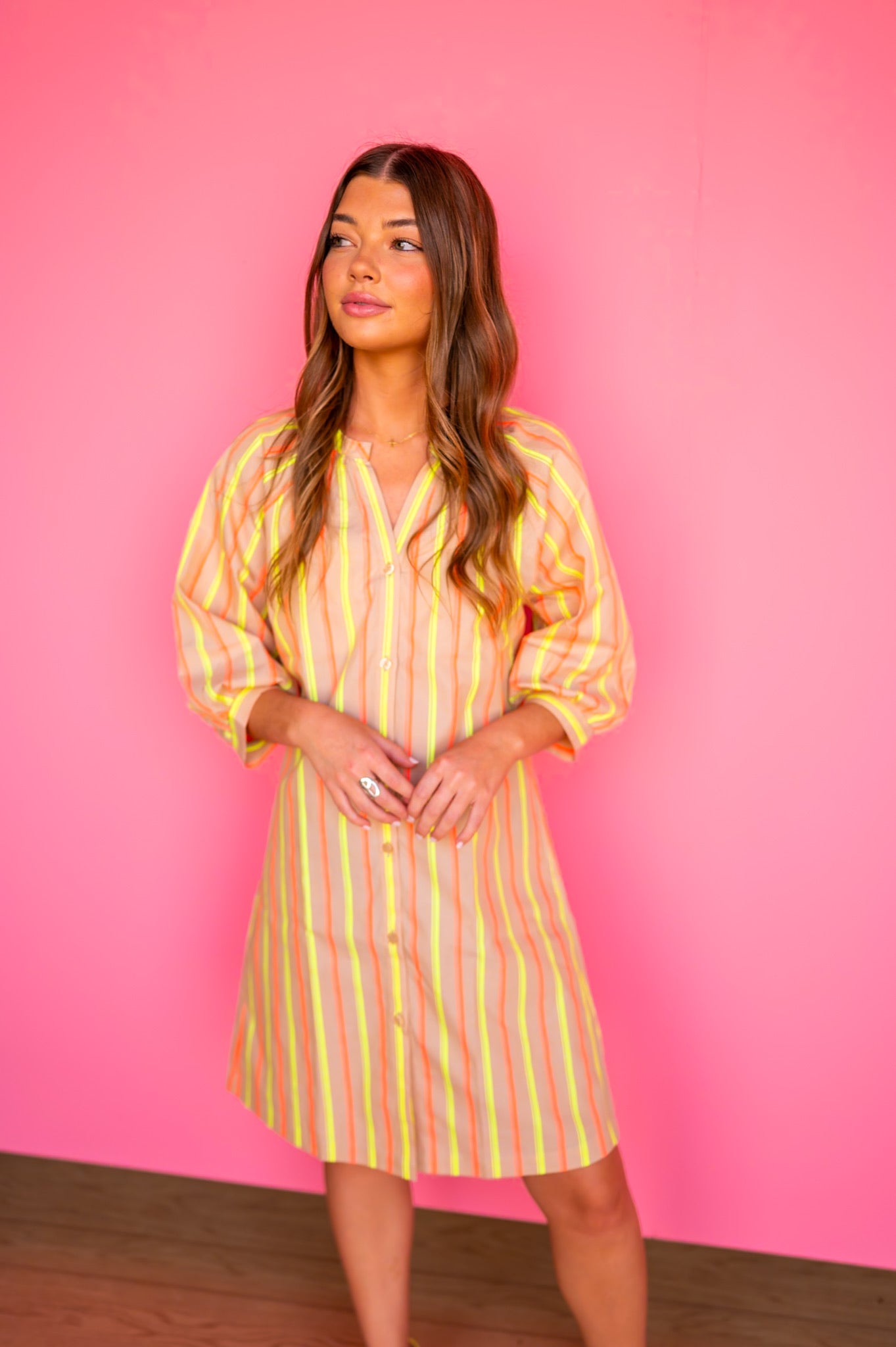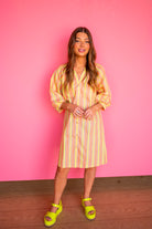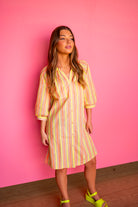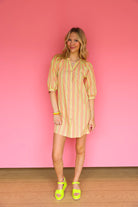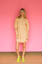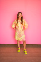 Upgrade your wardrobe with the beautifully designed Amanda Desert Stripe Dress from S'EDGE! With its flattering v neckline and comfortable linen blend, this dress will become your go-to for any occasion. Get ready to turn heads and feel confident in this must-have dress.