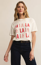 Made from soft cotton jersey with a vintage-inspired wash, this boyfriend tee brings comfort and playfulness in equal measure. The bold “Fa La La” graphic with gold foil detail makes it an instant favorite for layering this season.