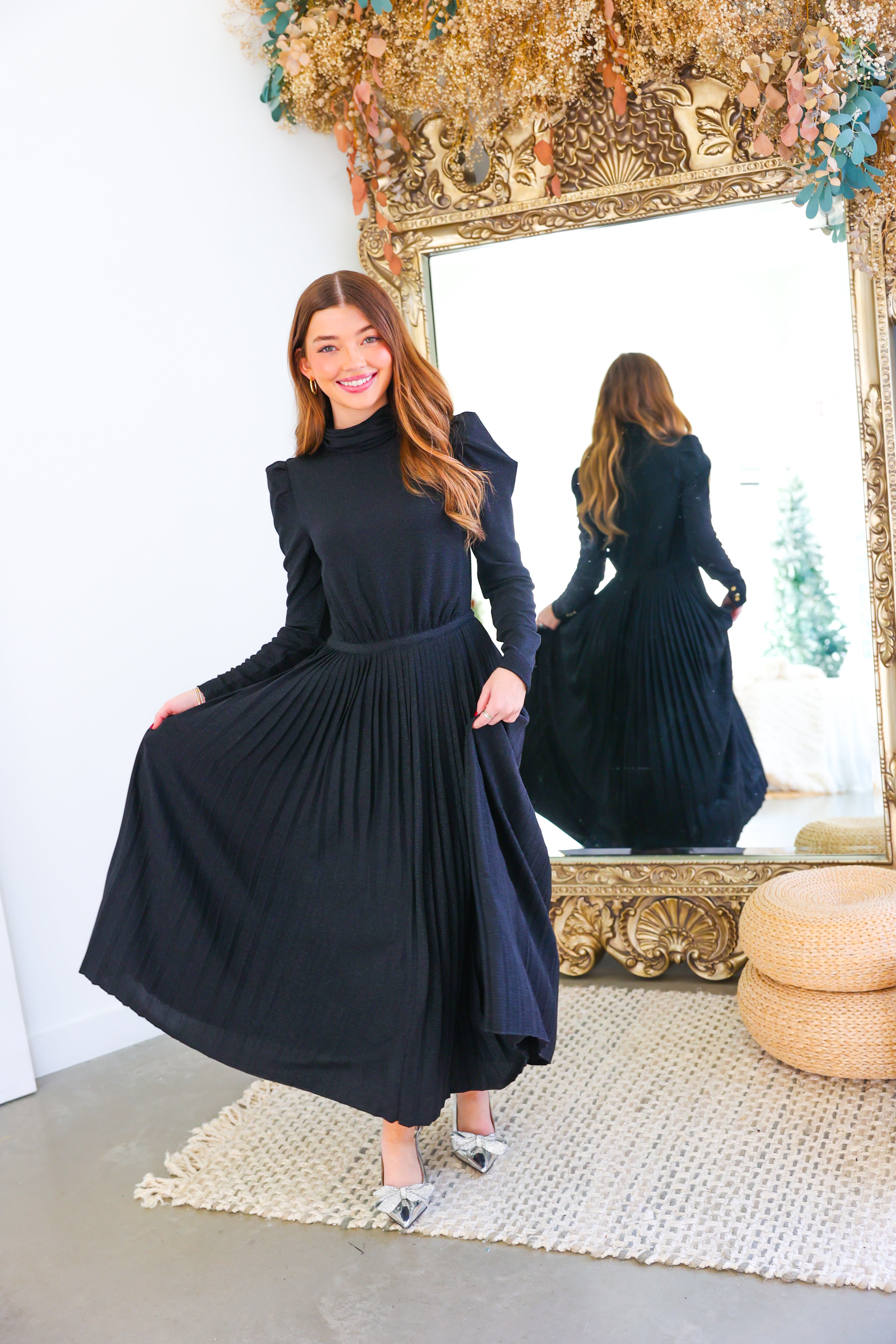 The Tessa Dress in Tap Shoe features a pleated mock neck and fitted bodice, flowing into a graceful pleated midi-length skirt. A hidden back zipper with a signature gold logo pull ensures a seamless finish. Crafted in a subtly shimmering fabric, this design is the ultimate party dress—made for moving, mingling, and dancing the night away in style.