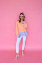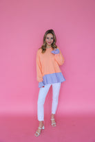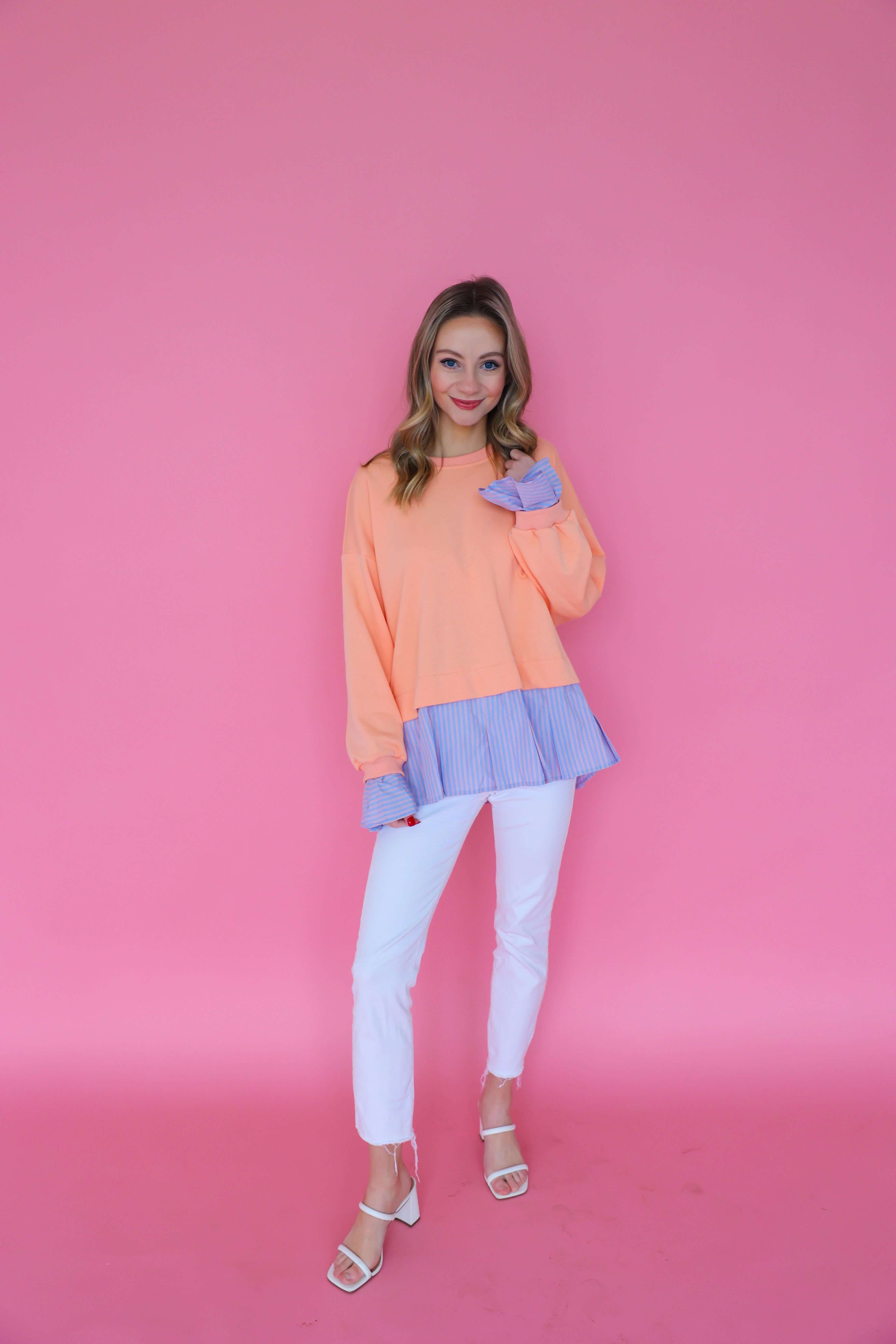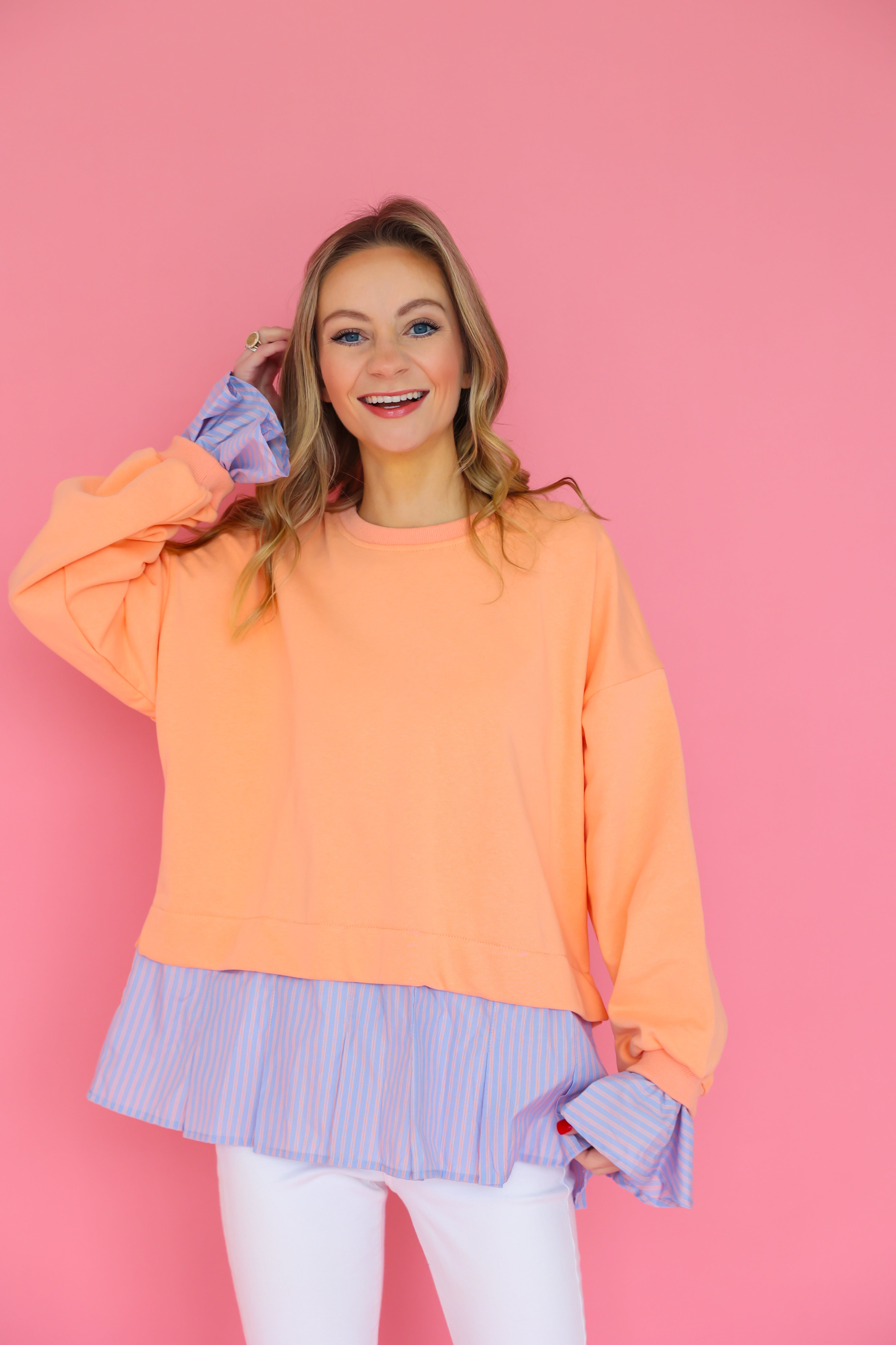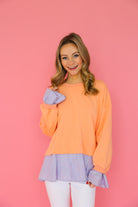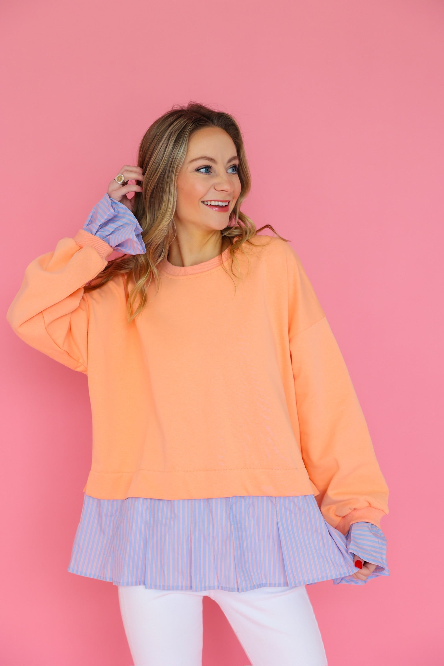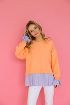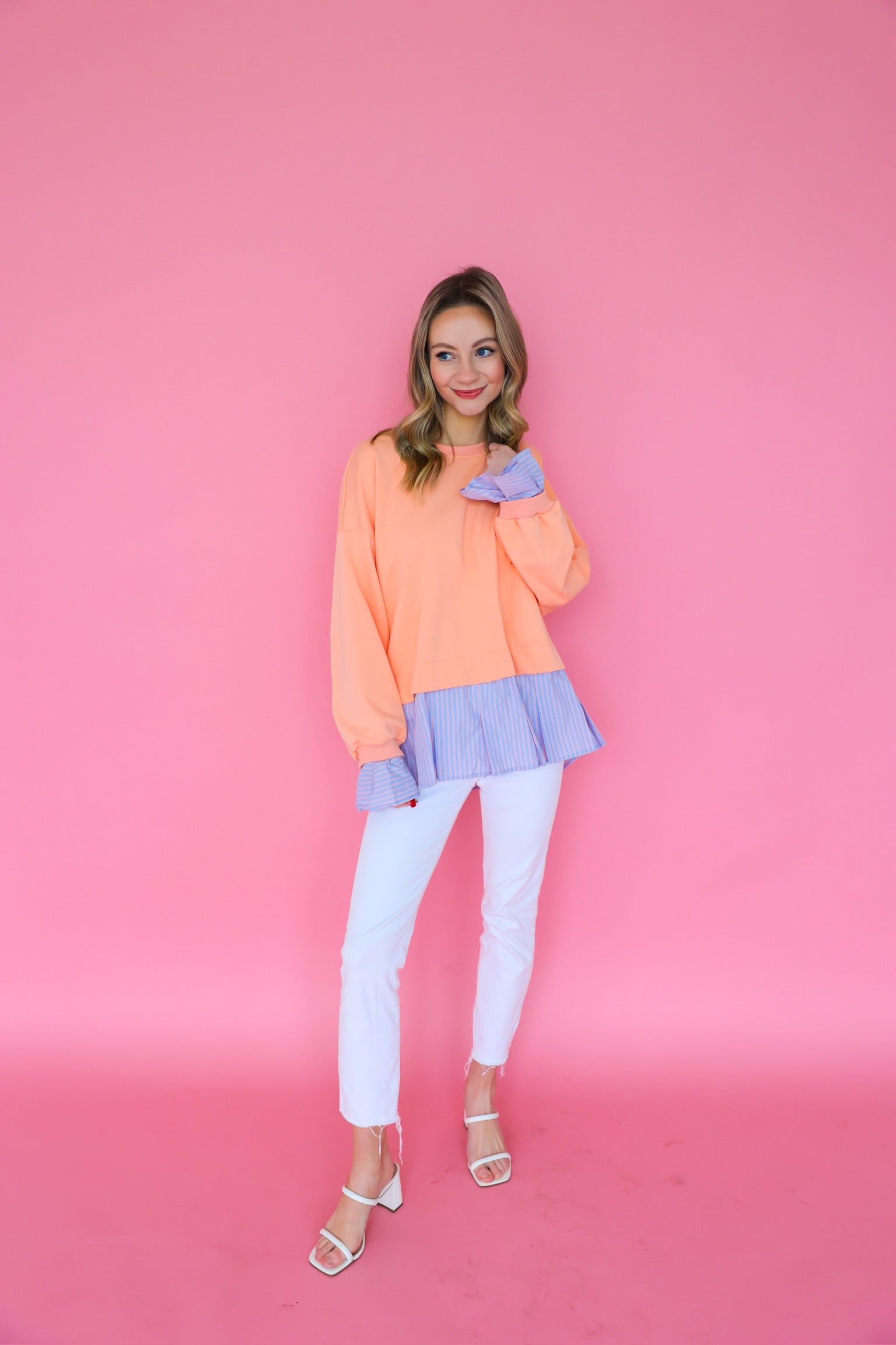 Brighten up your wardrobe with this playful pullover! This apricot top features a solid terry crew neck and contrasting ruffle sleeves for a unique pop of color. The pleated twofer top adds fun texture to this comfy and stylish piece!