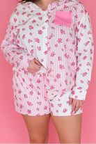 Get ready to bloom this spring with our playful So Spring Stripe & Floral Poplin Shorts! Made with a mix of pink and white cotton poplin, these shorts feature a fun stripe and floral print. Complete the look with the matching top and keep it comfy with an adjustable tie waist. Perfect for sunny days and laid-back vibes!