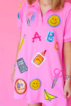 - Bursting with playful school-themed stickers like glue, pencils, smiley faces, and A+ stickers—this dress is made for standout classroom style!