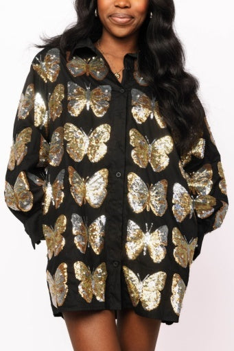 Black & Gold Sequin Butterfly Cotton Button Up Dress Queen of Sparkles