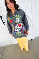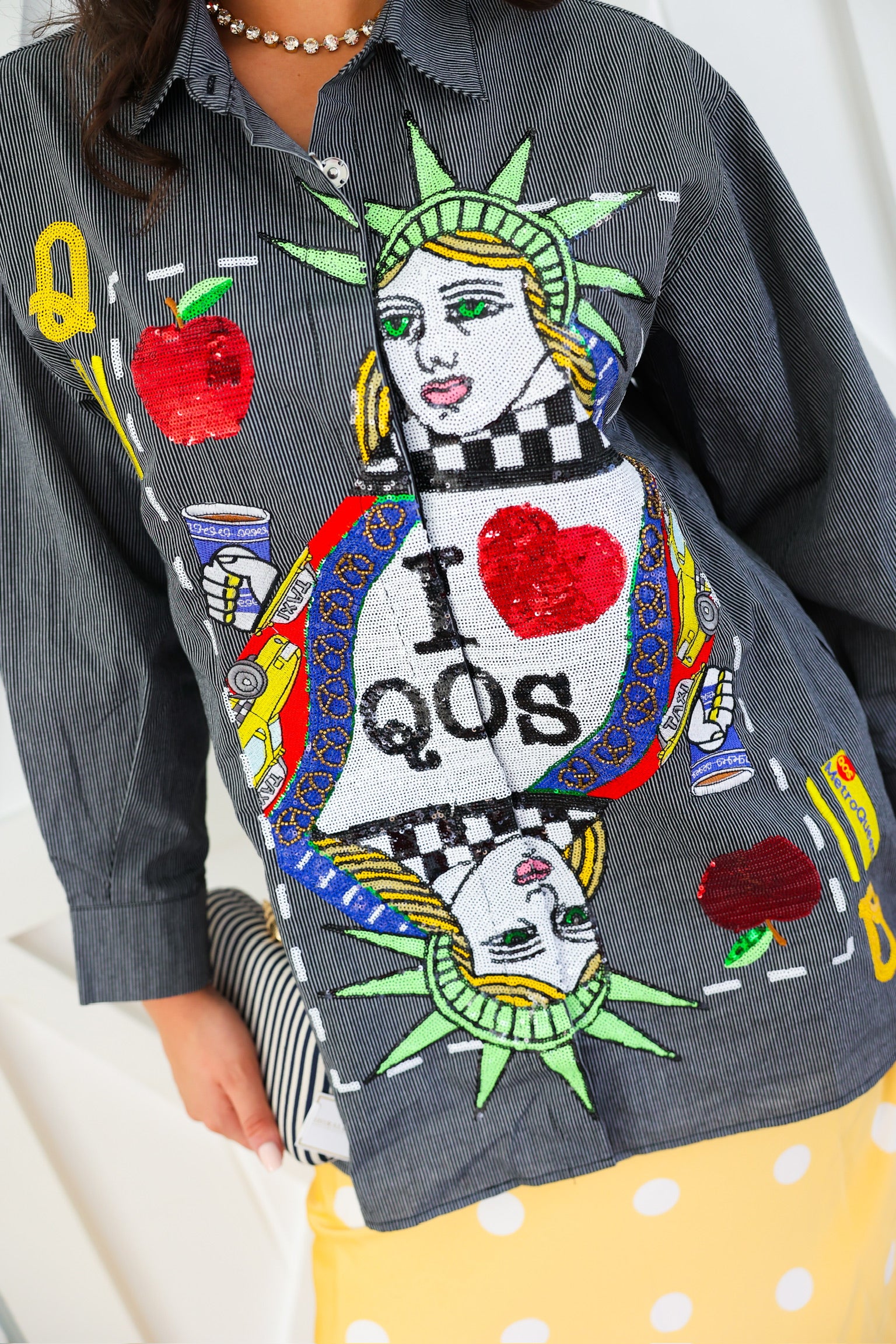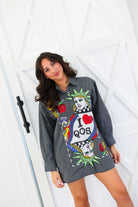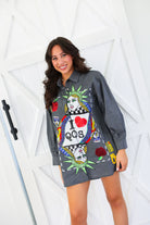 Queen of Sparkles Black Striped NYC Queen Card Logo Button Up Cotton Tunic