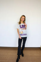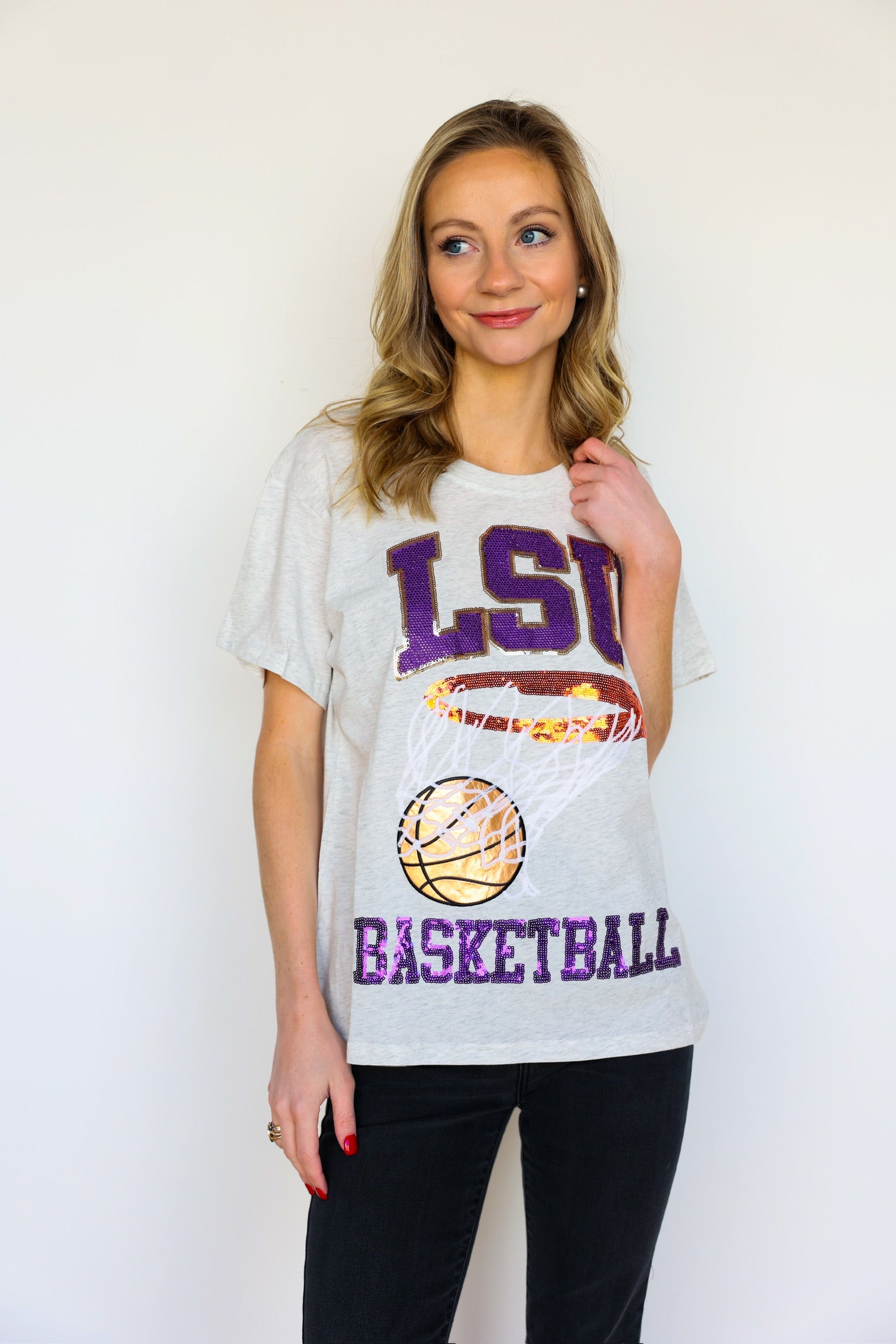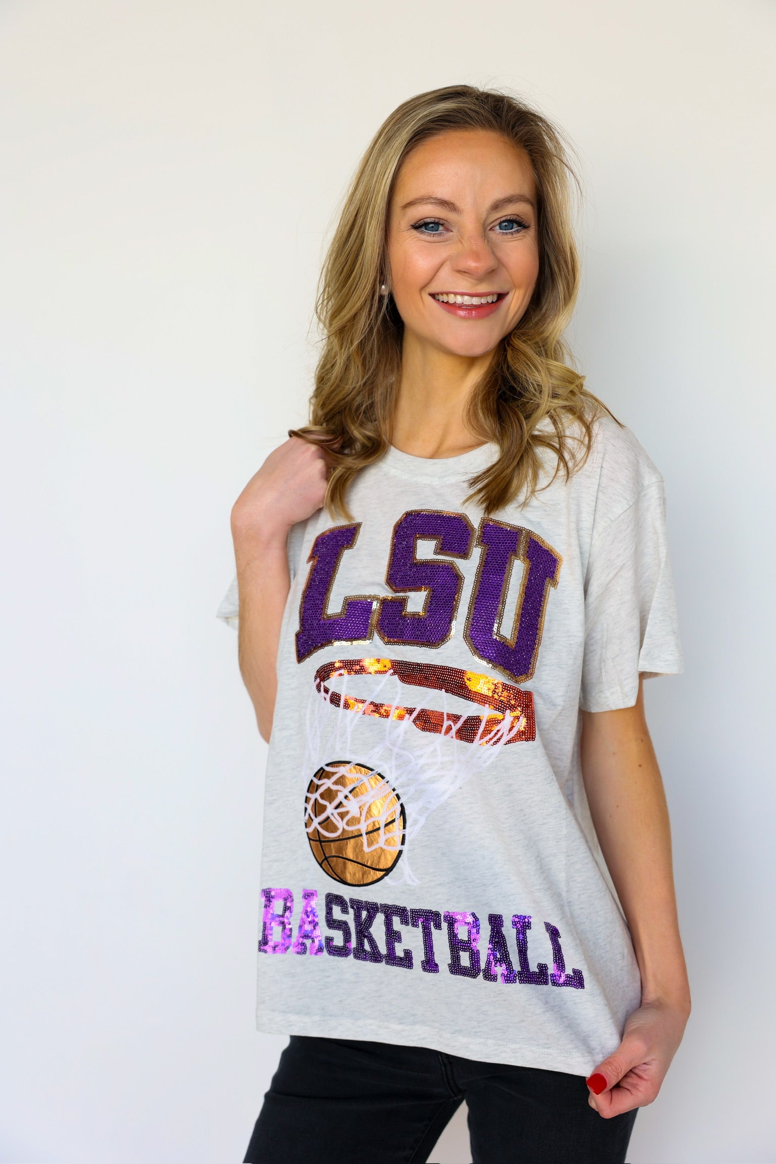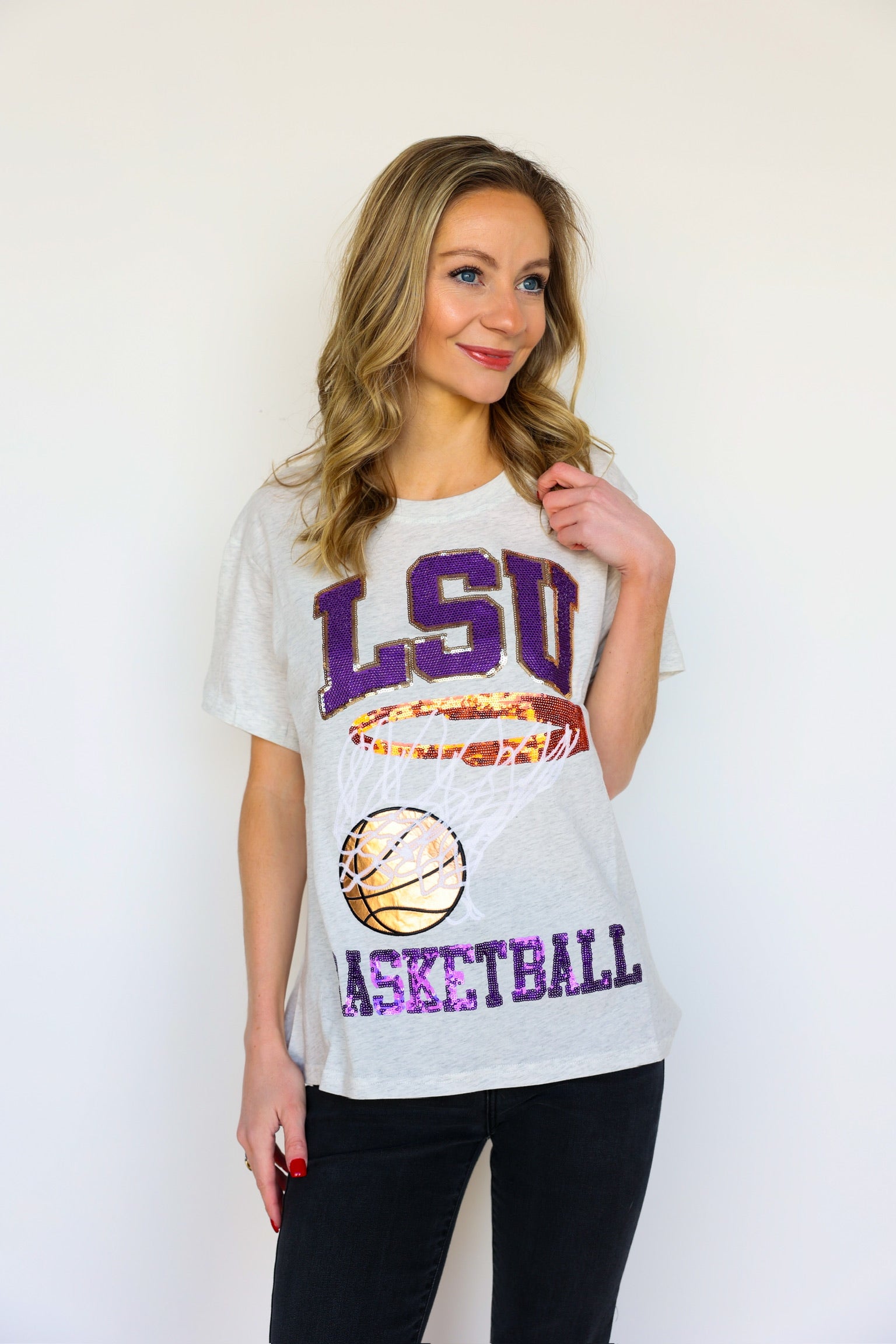 Get ready to bring some sparkle to the basketball court with our Grey LSU Basketball Tee! Featuring an all over sequin design, this tee will have you gameday ready in no time. Show off your love for LSU and your unique style with this playful and eye-catching tee.