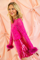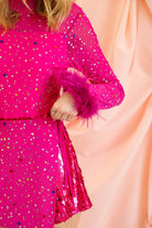 Step into the spotlight with this show-stopping pink romper that commands attention from every angle. Luxurious feather sleeves add movement and drama, while cascading rhinestones and sequins catch the light with every gesture. The flattering short silhouette keeps you comfortable without sacrificing glamour, making it perfect for nights when you want to feel like royalty. Whether you're hitting the dance floor or making a grand entrance, this Queen of Sparkles piece transforms any occasion into an unforgettable moment. Embrace your inner diva and shine brighter than ever.