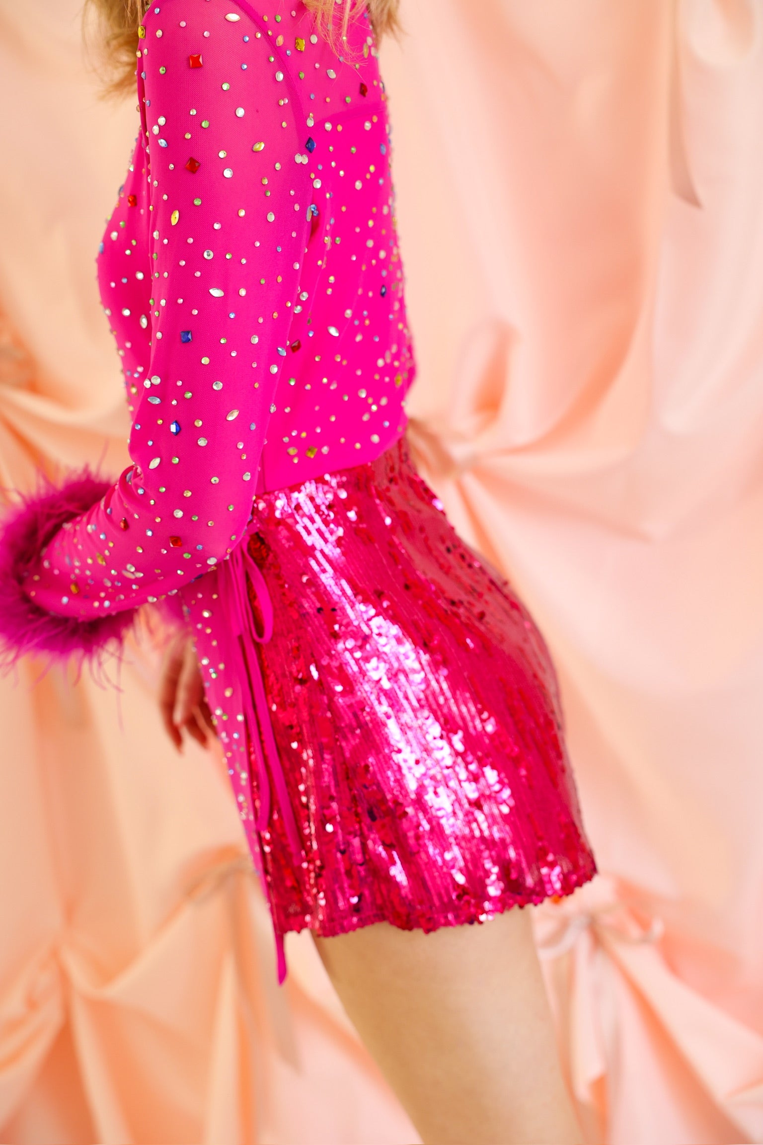 Pink Feather Sleeve Multi Rhinestone Sequin Short Romper Queen of Sparkles