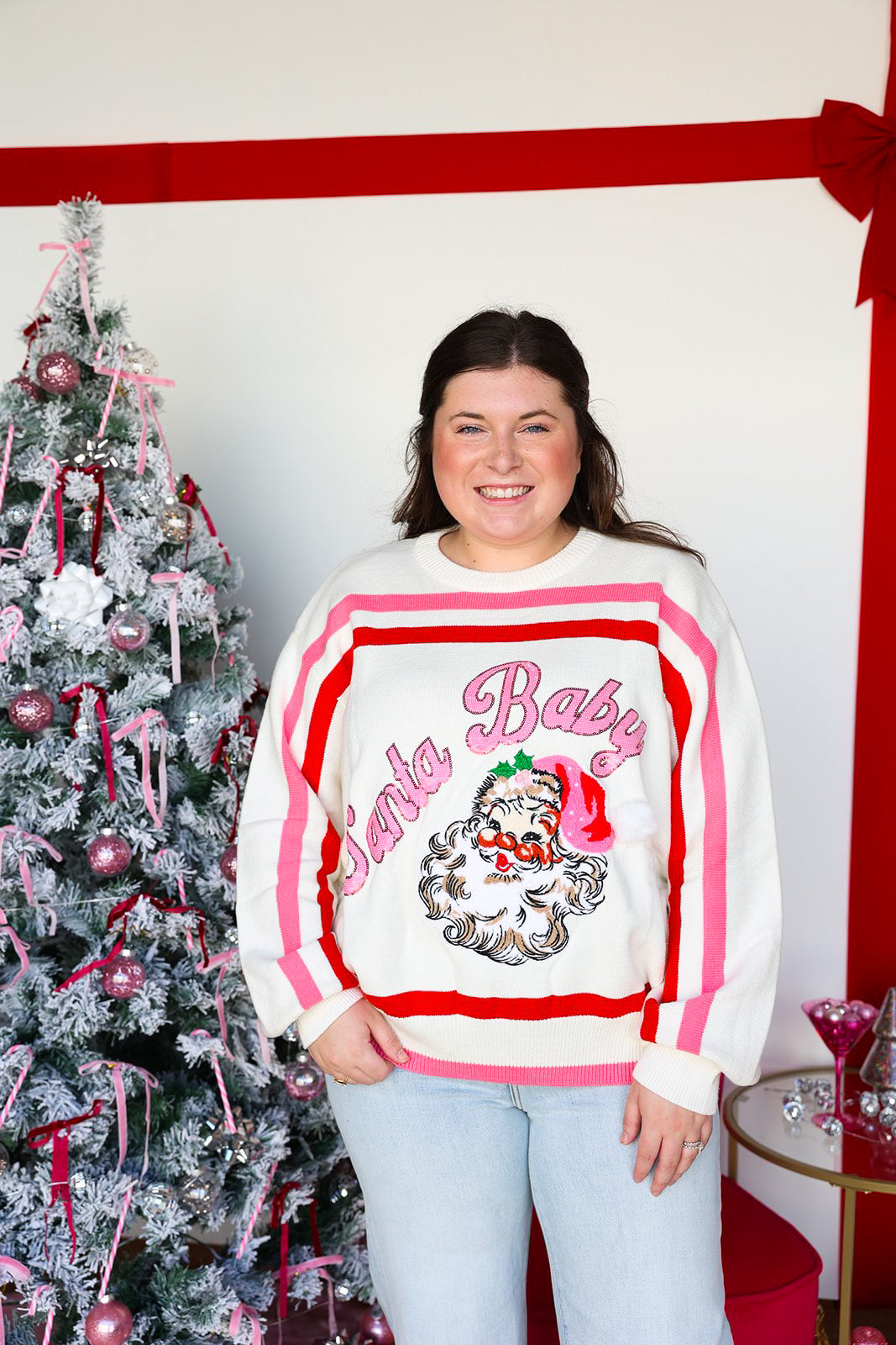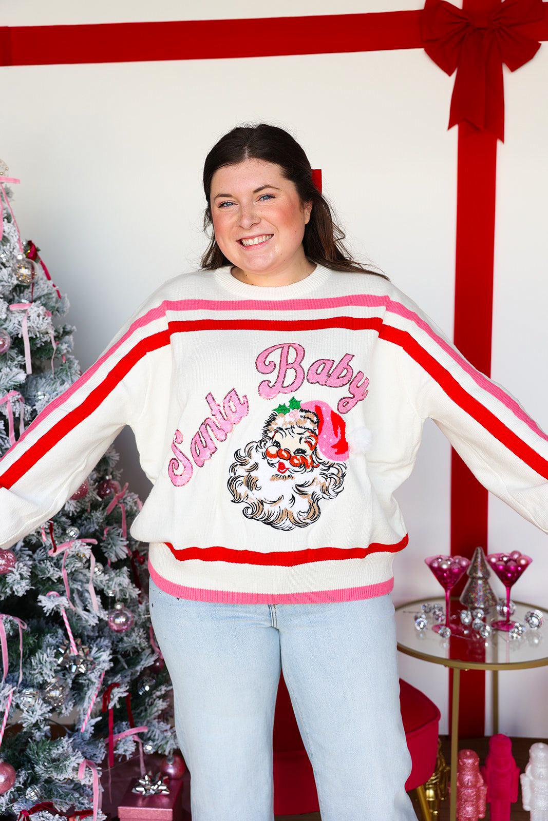 Red Pink White Stripe Santa Baby Fuzzy Santa Sweater Queen of Sparkles