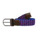 The Plymouth three-toned herringbone woven elastic-stretch belt. Navy, Red and White belt with a rounded buckle and dark brown leather finish stamped with the Roostas logo. An adjustable clasp goes through the woven belt, allowing for adaptable sizing. Designed for comfort both on and off the course.